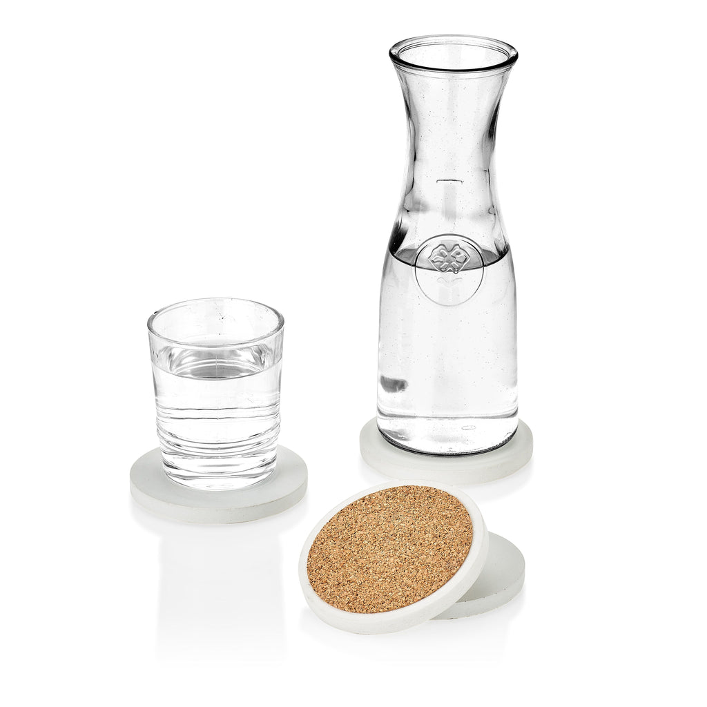 The Port Living Concrete Round Coasters offer the benefit of being both absorbent and relatively stain resistant due to the sealer used; yielding just the right porosity to the coasters. Backed with cork for tabletop protection.